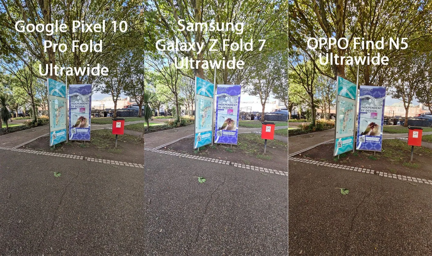 Partendo dalla modalità ultrawide, si è osservato che nessuno dei dispositivi ha brillato particolarmente in questo ambito. Le tonalità dei colori differivano notevolmente tra i modelli: il Galaxy Z Fold 7 risultava sbiadito, mentre il Pixel 10 Pro Fold presentava colori più realistici ma con alcune sovraesposizioni. L’OPPO Find N5 ha dimostrato prestazioni superiori in questa categoria.