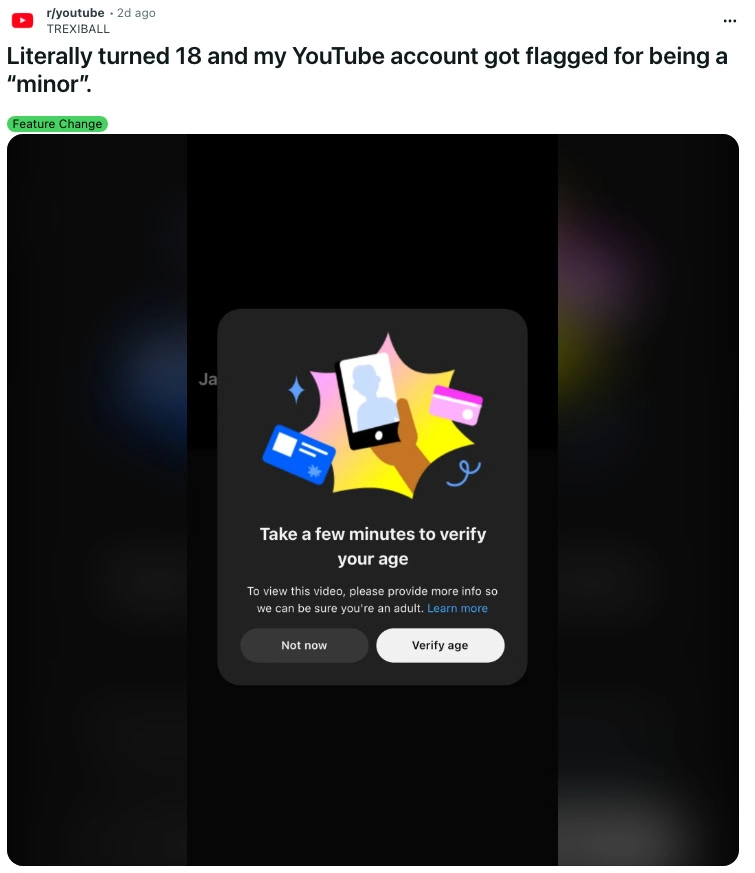 Un utente ha dichiarato di avere più di 18 anni, mentre un altro ha specificato che la sua età è 21 anni; nonostante ciò, YouTube continua a identificarli come minori. In situazioni simili a quelle degli account per bambini, viene visualizzato un messaggio che avvisa: “Sono state modificate alcune impostazioni. Non siamo riusciti a verificare che tu sia un adulto.” Gli utenti possono quindi scegliere se continuare ad utilizzare il servizio con restrizioni o procedere alla verifica della propria età.