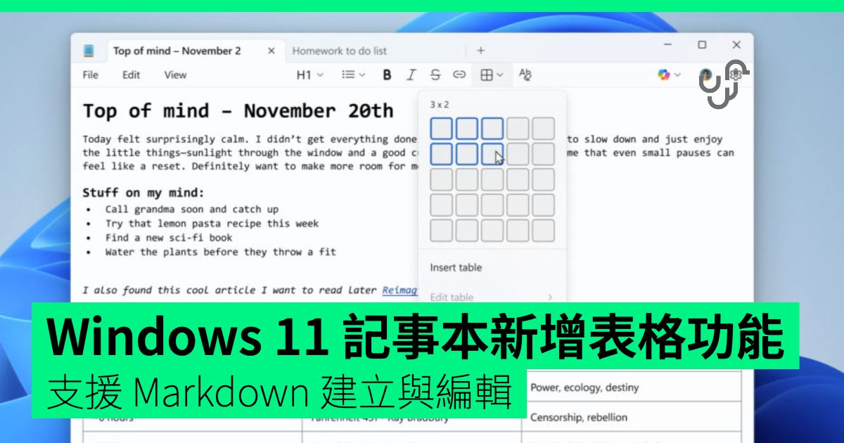 L’ultima versione di Notepad (11.2510.6.0) amplia le capacità di formattazione leggera includendo la possibilità di creare e modificare tabelle. Questa novità può essere utilizzata sia tramite l’apposita voce nel menu della barra degli strumenti che impiegando la sintassi Markdown per l’inserimento diretto.