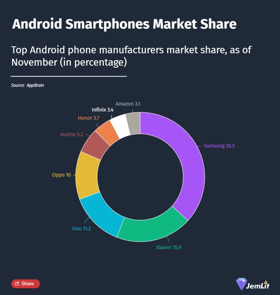 samsung e la quota di mercato smartphone android a novembre 2025