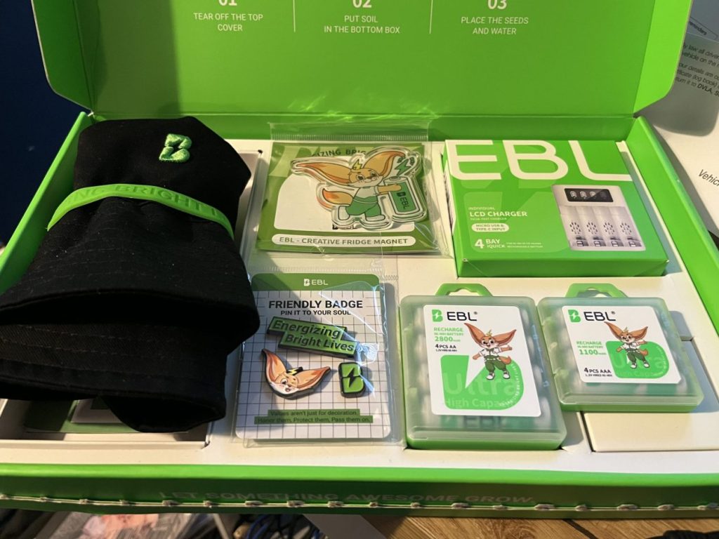 Il set EBL viene proposto anche nella versione Greenwave Gift Box, un confezionamento curato che include oltre al caricabatterie e alle pile anche accessori promuoventi la sostenibilità energetica. Tra gli oggetti presenti: