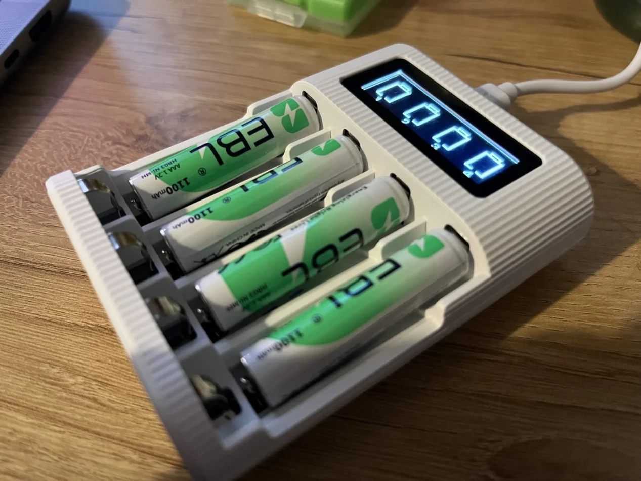 Il caricabatterie EBL si distingue come uno dei migliori nel suo settore grazie a una struttura solida ma maneggevole. È progettato per ospitare facilmente sia batterie AA che AAA, con alloggiamenti che assicurano una presa stabile senza risultare fragili o economici. Un elemento di rilievo è lo schermo integrato sopra ogni batteria che indica chiaramente il livello di carica residua, consentendo così un utilizzo flessibile e consapevole delle singole celle.