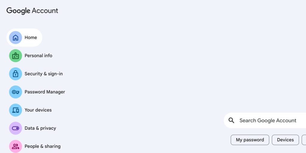 L’accesso al Password Manager rimanda al sito passwords.google.com senza modifiche grafiche, mentre la sezione “Your devices” è stata separata dalla precedente categoria “People & sharing”. La nuova area Family Group consente la gestione dei gruppi familiari, mentre il collegamento a Google One Storage indirizza direttamente alla piattaforma one.google.com.