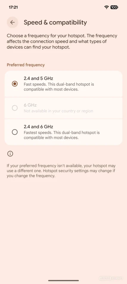 Attualmente, Android crea hotspot utilizzando esclusivamente le bande a 2.4GHz e 5GHz, escludendo la frequenza a 6GHz, supportata dalla maggior parte dei dispositivi più moderni. Questa limitazione influisce negativamente sulle prestazioni della connessione WiFi, soprattutto in termini di velocità. La scelta originaria era dovuta sia alla scarsa diffusione del supporto al 6GHz nei dispositivi sia alle restrizioni normative vigenti in alcune aree geografiche come gli Stati Uniti.