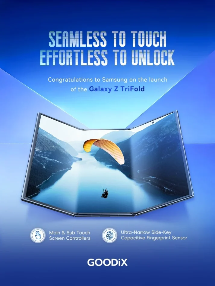 Oltre al sensore, Goodix ha progettato anche i pannelli touchscreen avanzati utilizzati nel Galaxy Z TriFold, comprendendo sia il controller principale che quello secondario dei display. Si tratta di una soluzione altamente personalizzata, poiché dispositivi simili con tripla piega sono estremamente rari; un esempio comparabile è rappresentato dal Huawei Mate XT.