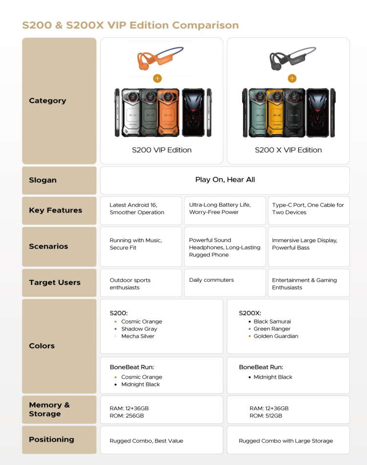 DOOGEE presenta i modelli S200 e S200 X VIP Edition, smartphone rugged che integrano l’ultima versione di Android, la 16, e sono accompagnati dalle cuffie a conduzione ossea BoneBeat Run, progettate appositamente per l’utilizzo all’aperto. Questi dispositivi si distinguono per un ampio schermo da 6,72 pollici con refresh rate a 120Hz, batterie di grande capacità con oltre 25 giorni di autonomia in standby e configurazioni hardware avanzate che comprendono fino a 12GB di RAM espandibile virtualmente e fino a 512GB di memoria interna.