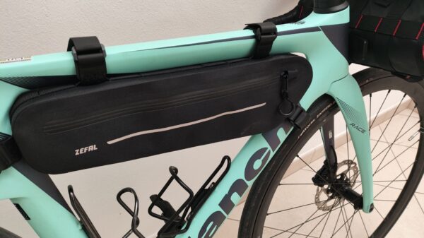 la z adventure c3 è una borsa da telaio mid-size con una capacità massima di 3,3 litri, progettata per offrire spazio utile senza compromettere la guidabilità o l’accesso agli elementi della bicicletta. al primo contatto trasferisce una sensazione di robustezza ponderata e ben studiata. il tessuto tecnico impermeabile resiste a pioggia, fango e polvere, mantenendo una flessibilità adeguata che evita rigidità e ingombro eccessivi. l’equilibrio tra resistenza e flessibilità risulta cruciale durante i viaggi.