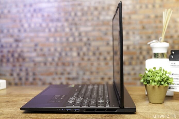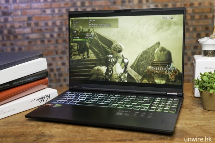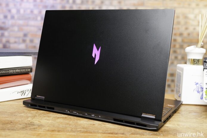 Il profilo è stuccato di metallo con spessore indicato di 19,9 mm e peso di 2,1 kg; la copertura superiore e inferiore adottano una struttura metallica con logo riflettente che cambia colore in base alla luce. La tastiera presenta un retroilluminazione a 4 zone e il paraurti anteriore integra una scanalatura per aprire facilmente il coperchio. Il design complessivo privilegia la trasportabilità senza rinunciare all’efficienza termica.