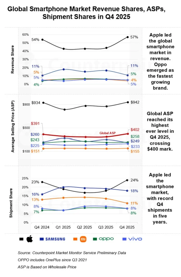 l’analisi di Counterpoint Research fornisce un quadro aggiornato sul prezzo medio globale di vendita degli smartphone, evidenziando una soglia storica raggiunta nel quarto trimestre del 2025. stando ai dati, la media mondiale si attesta intorno a $400, cifra che riflette differenze regionali e di marca senza indicare necessariamente la spesa effettiva sostenuta dai consumatori in ogni mercato.