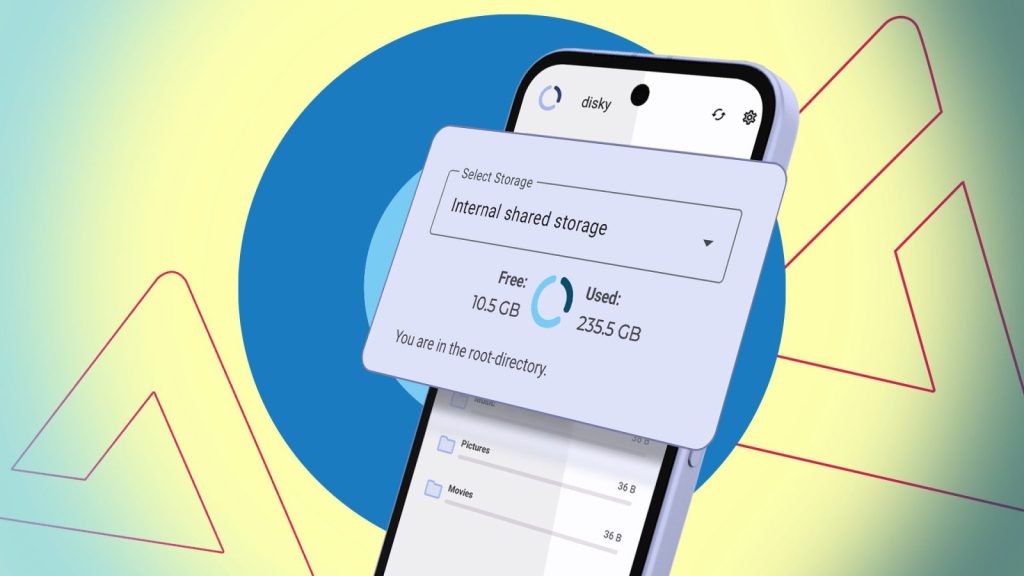 disky è disponibile non sul Google Play Store, ma attraverso archivi alternativi come f-droid. L’interfaccia è estremamente intuitiva: all’avvio avvia l’analisi dell’intero archivio e presenta una visualizzazione a torta che mostra lo spazio utilizzato e lo spazio libero. Sotto, elenca gli elementi in ordine decrescente per dimensione, con la possibilità di cambiare l’ordinamento in base all’alfabeto. L’aggiornamento dell’analisi è possibile premendo un pulsante di ricarica.