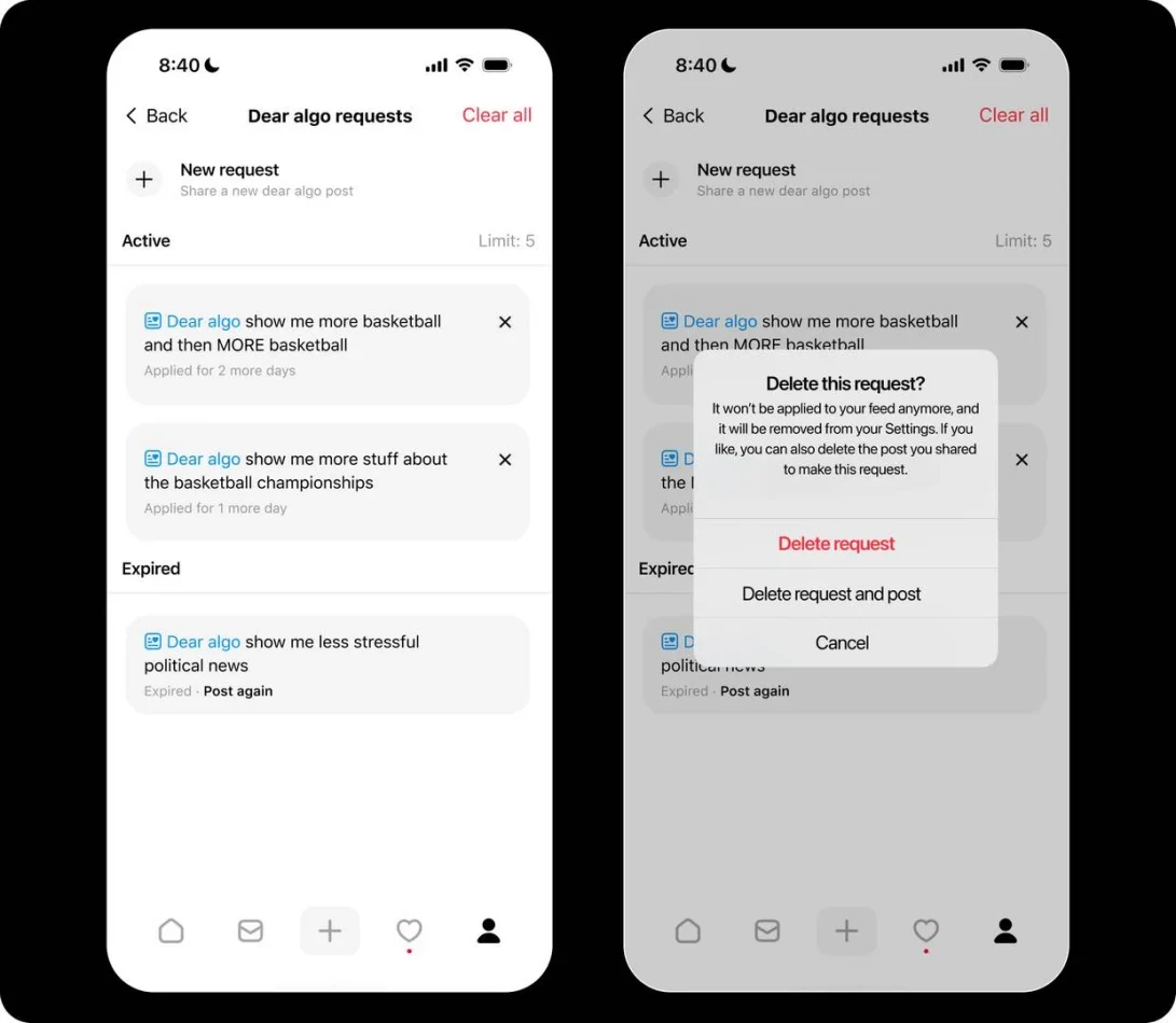dear algo su threads: controllo ia del feed