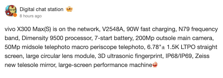 Il documento di certificazione in Cina riporta il modello V2548A, ritenuto attribuibile alla x300 max. all’interno del registro non vengono forniti dettagli hardware, ma un leaker fornisce elementi utili per capire la direzione della proposta. Digital Chat Station indica che la versione identificata come V258A potrebbe integrare un Dimensity 9500 e una batteria di almeno 7000 mAh con supporto a una ricarica rapida da 90 W.