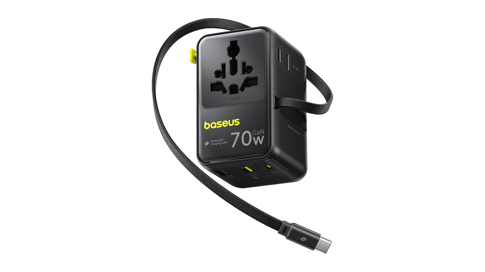 Questo caricatore integra anche un cavo USB-C retrattile, una soluzione pratica per gestire i cavi senza ingombro. Oltre al cavo retrattile, è presente una seconda porta USB-C, insieme a due porte USB-A e a una presa universale, offrendo la possibilità di ricaricare più dispositivi contemporaneamente.