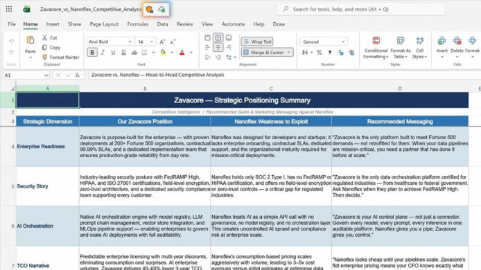Viene costruita una visione d’insieme con tabelle comparative tra concorrenti, documenti di proposta di valore e presentazioni per i clienti, definendo milestone, responsabili e passi operativi per tradurre la strategia in azioni concrete.